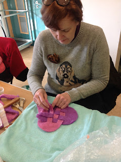 Pleasance is working on a pair of felted slippers.