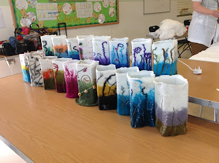 A great afternoon felting with Gabi McGrath & Yvonne Shields. Using cotton gauze bandage was new to all & with only a single layer this felted up really quickly. Lampshades everywhere lit the room.