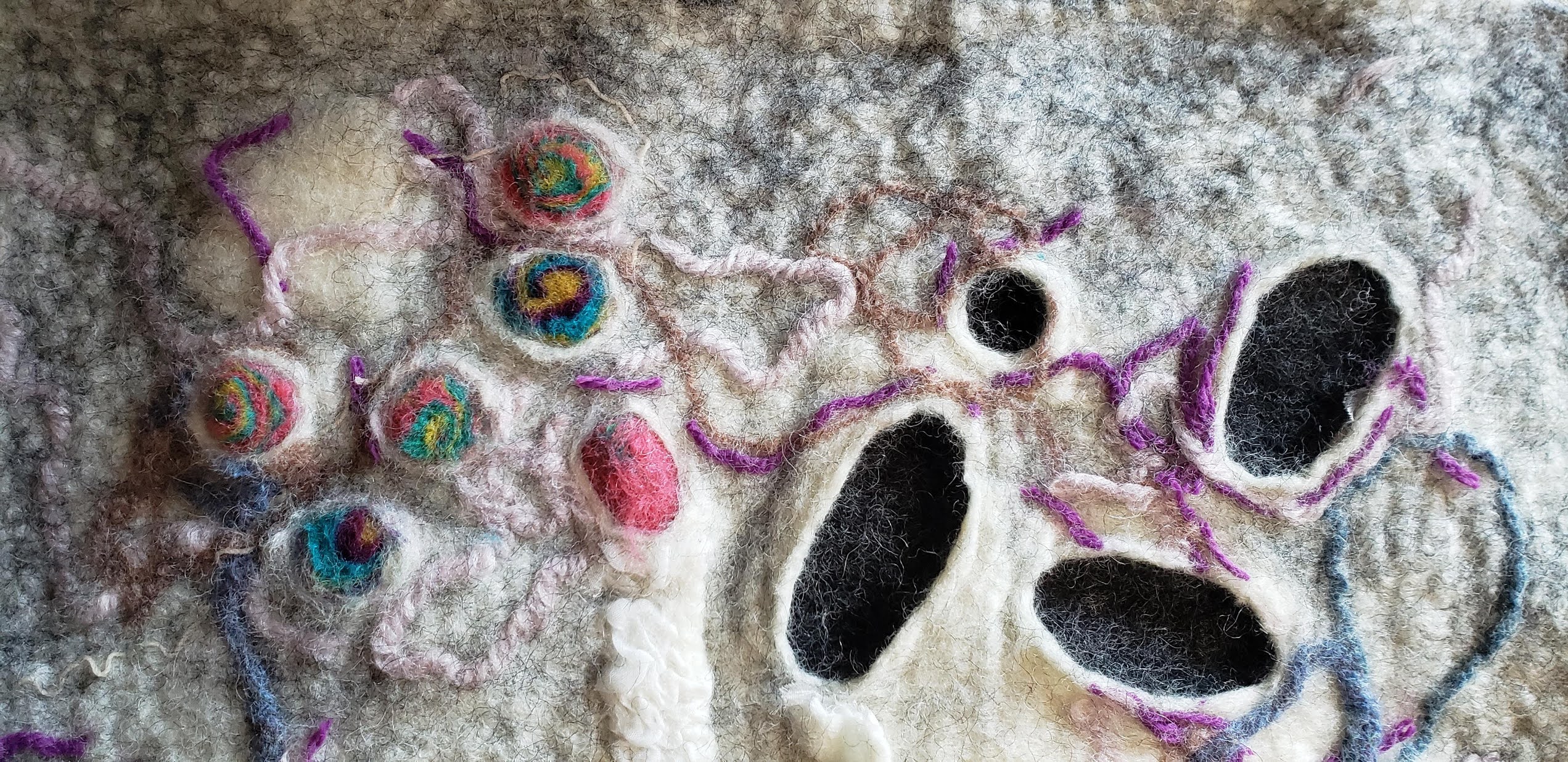 The videos were then shared with members and at the October and November Felt-ins via Zoom we discussed the techniques and shared some of our work with one another.  While it wasn’t as good as the real thing, it has kept us all together and still making felt.
