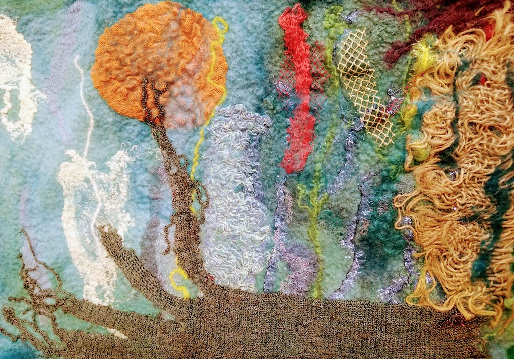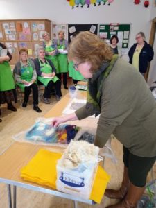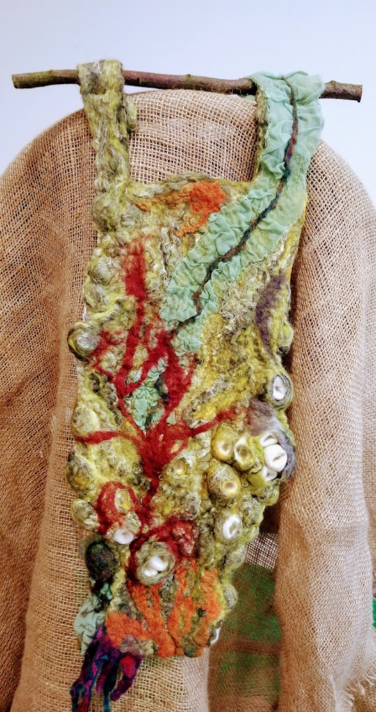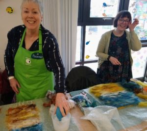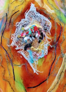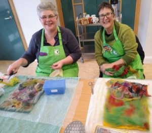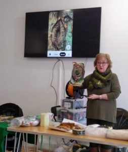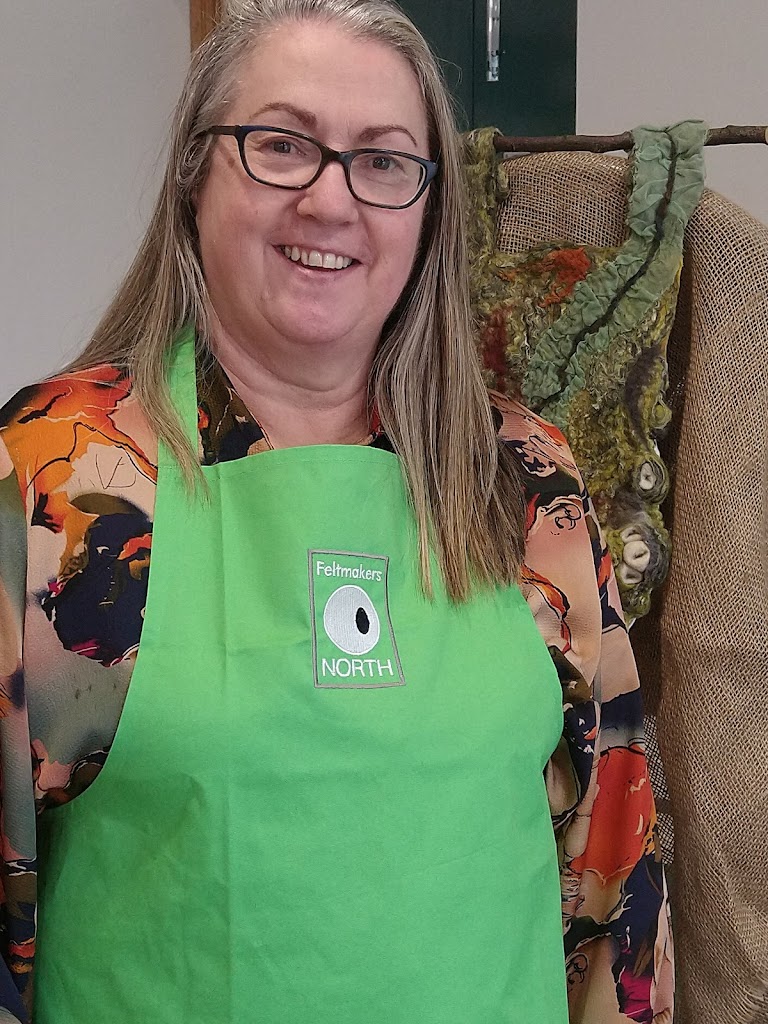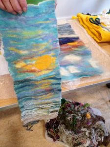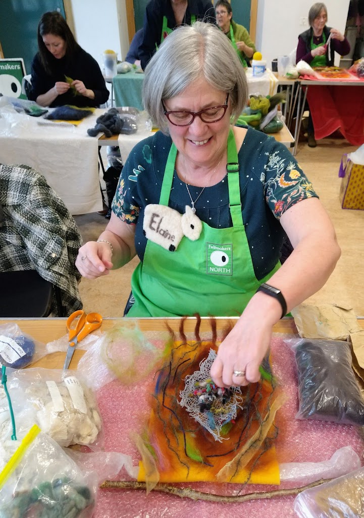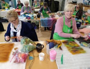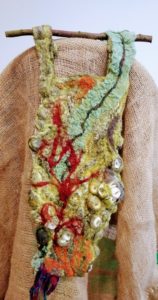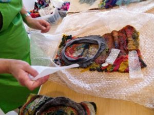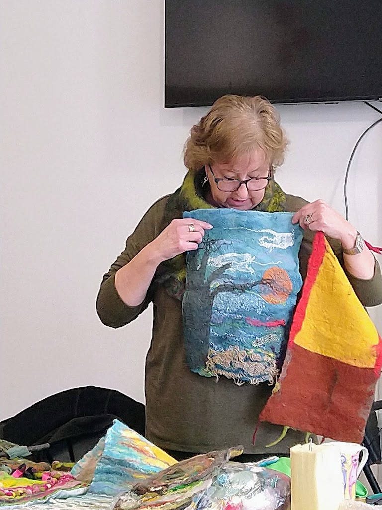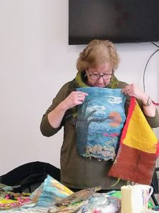Feltmakers North members and visitors were in for a real treat when our Deborah Woolsey, (Secretary of Feltmakers North) took the Felt-In on Saturday 18th March, St Patrick’s weekend and Mothering Sunday. Just look at the fabulous colours, texture, and the creative Shibori with holes and added embellishment. Deborah or Debbie, as she likes to go by in our group has came with such a display of beautiful wall hangings to show us all. What a variety of texture, technics, talent and creativity to inspire us all. Looking at the land & sea and putting this intention into her felt work through the use of scraps of material, wool fibers, silk, whatever is in your bag of goodies! Looking at the flowers from a previous summer, her Lupin’s grown in her garden and using them to develop her ideas for her wallhanging. The hanging was backed with a beautiful old tea cloth that was her mothers, to the surprise of her sister Joanne LOL. We love the stories that are shared in the group, especial when you cut up the good material that was an heirloom! Great use of timeless material that has history to it and always a story to share of its journey amongst felting friends with a lease of life once more given.