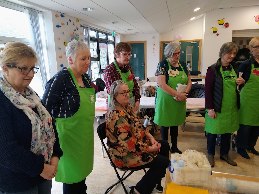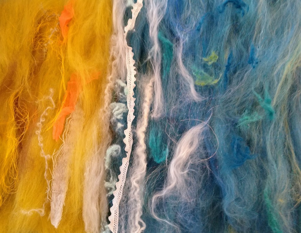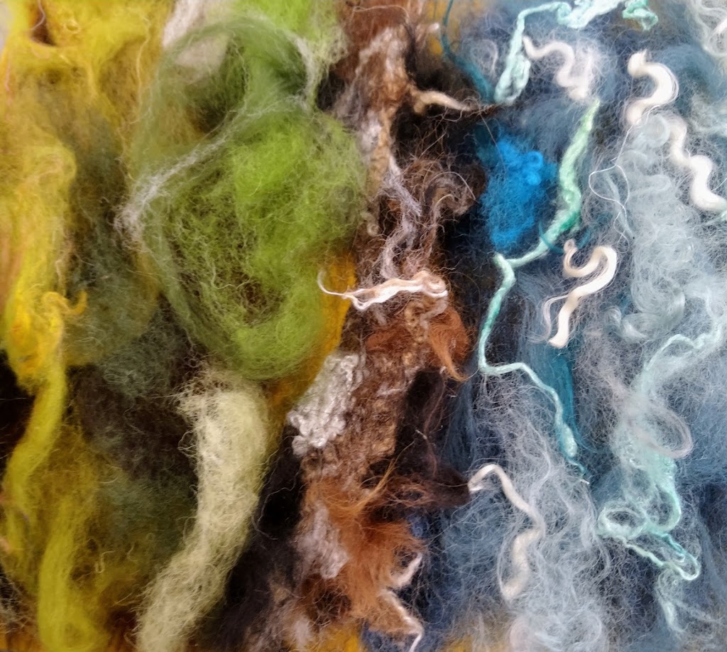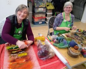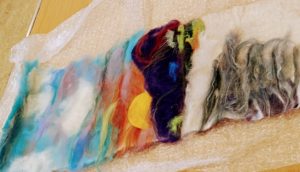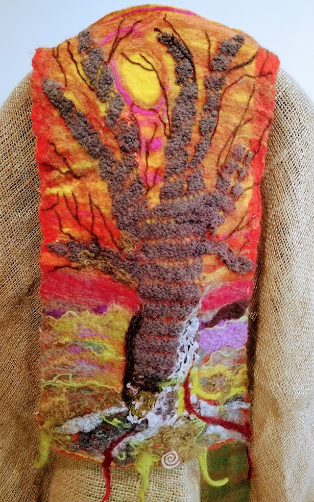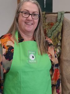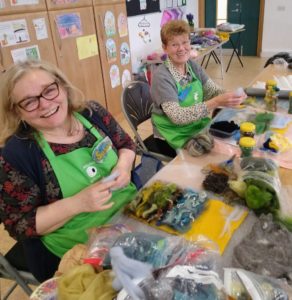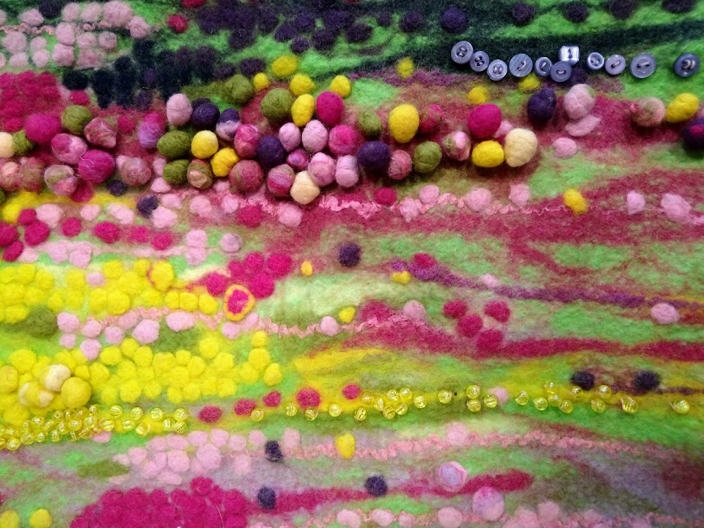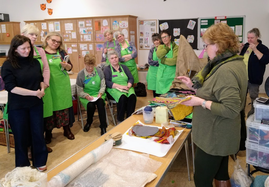 Feltmakers North members and visitors were in for a real treat when our Deborah Woolsey, (Secretary of Feltmakers North) took the Felt-In on Saturday 18th March, St Patrick’s weekend and Mothering Sunday. Just look at the fabulous colours, texture, and the creative Shibori with holes and added embellishment. Deborah or Debbie, as she likes to go by in our group has came with such a display of beautiful wall hangings to show us all. What a variety of texture, technics, talent and creativity to inspire us all. Looking at the land & sea and putting this intention into her felt work through the use of scraps of material, wool fibers, silk, whatever is in your bag of goodies! Looking at the flowers from a previous summer, her Lupin’s grown in her garden and using them to develop her ideas for her wallhanging. The hanging was backed with a beautiful old tea cloth that was her mothers, to the surprise of her sister Joanne LOL. We love the stories that are shared in the group, especial when you cut up the good material that was an heirloom! Great use of timeless material that has history to it and always a story to share of its journey amongst felting friends with a lease of life once more given.